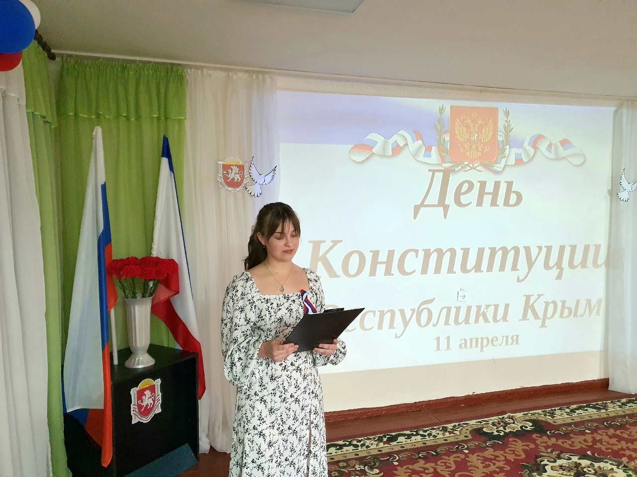 Перед собравшимися с докладом выступила обучающаяся 11.2-В группы Клюева Виолетта. В своем выступлении Виолетта подробно рассказала об истории принятия Конституции Республики Крым, её основных положениях и значении для жителей полуострова. Она подчеркнула, что Конституция является фундаментом правового государства, гарантирующего права и свободы граждан, а также определяющего структуру и полномочия органов власти.