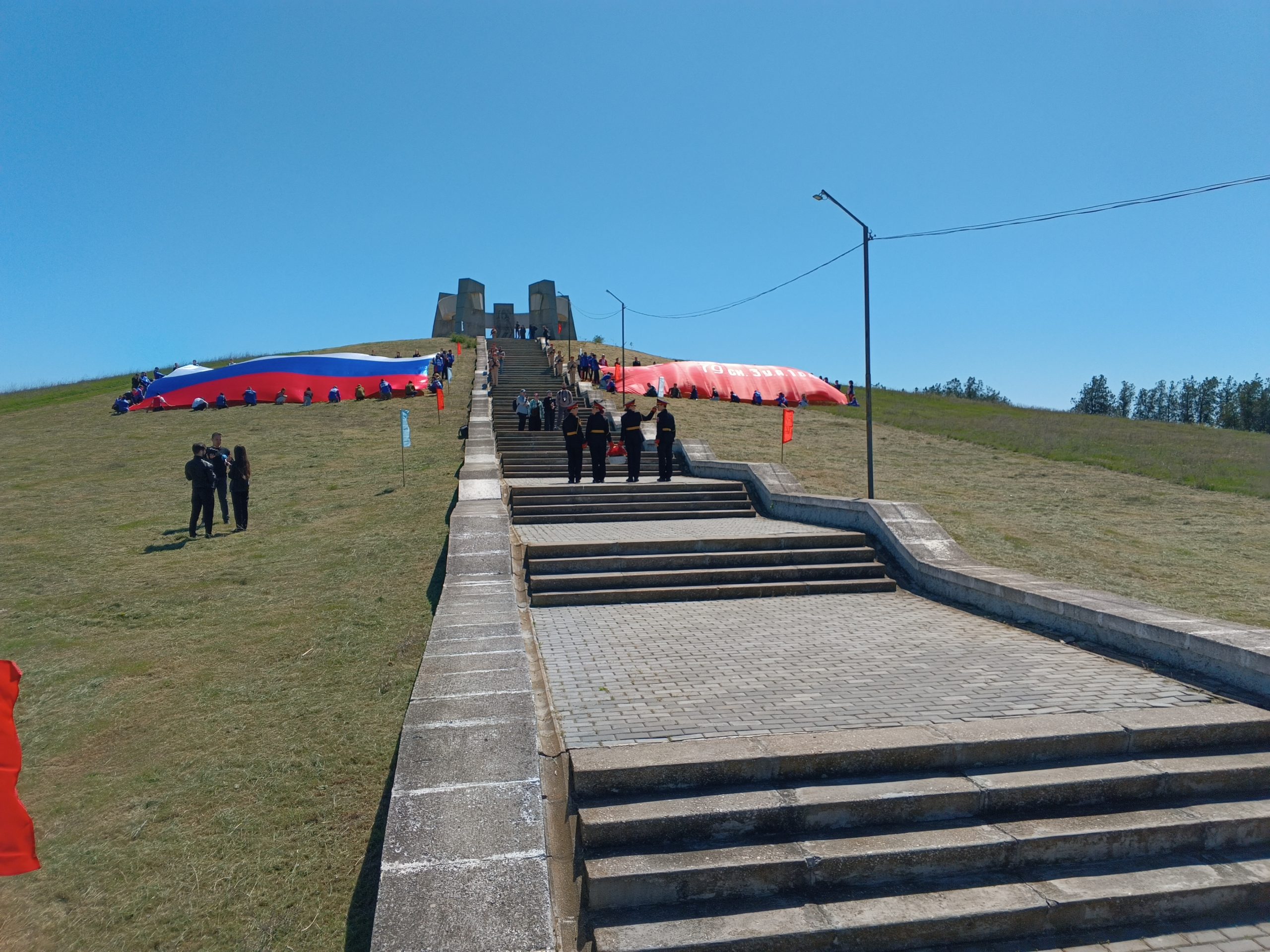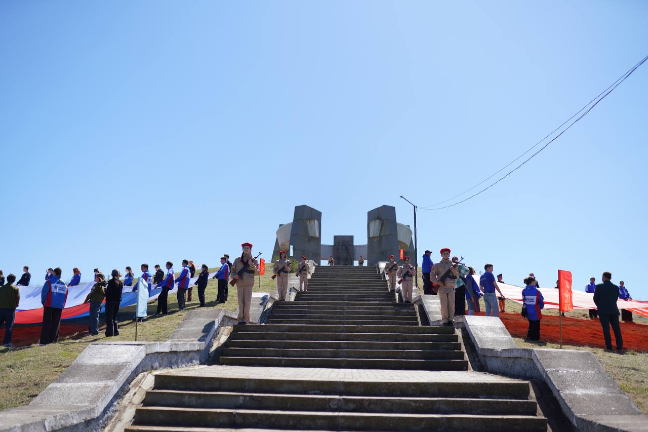 Ребята вместе развернули флаг России и Знамя Победы, а также возложили цветы в память о павших Героях.