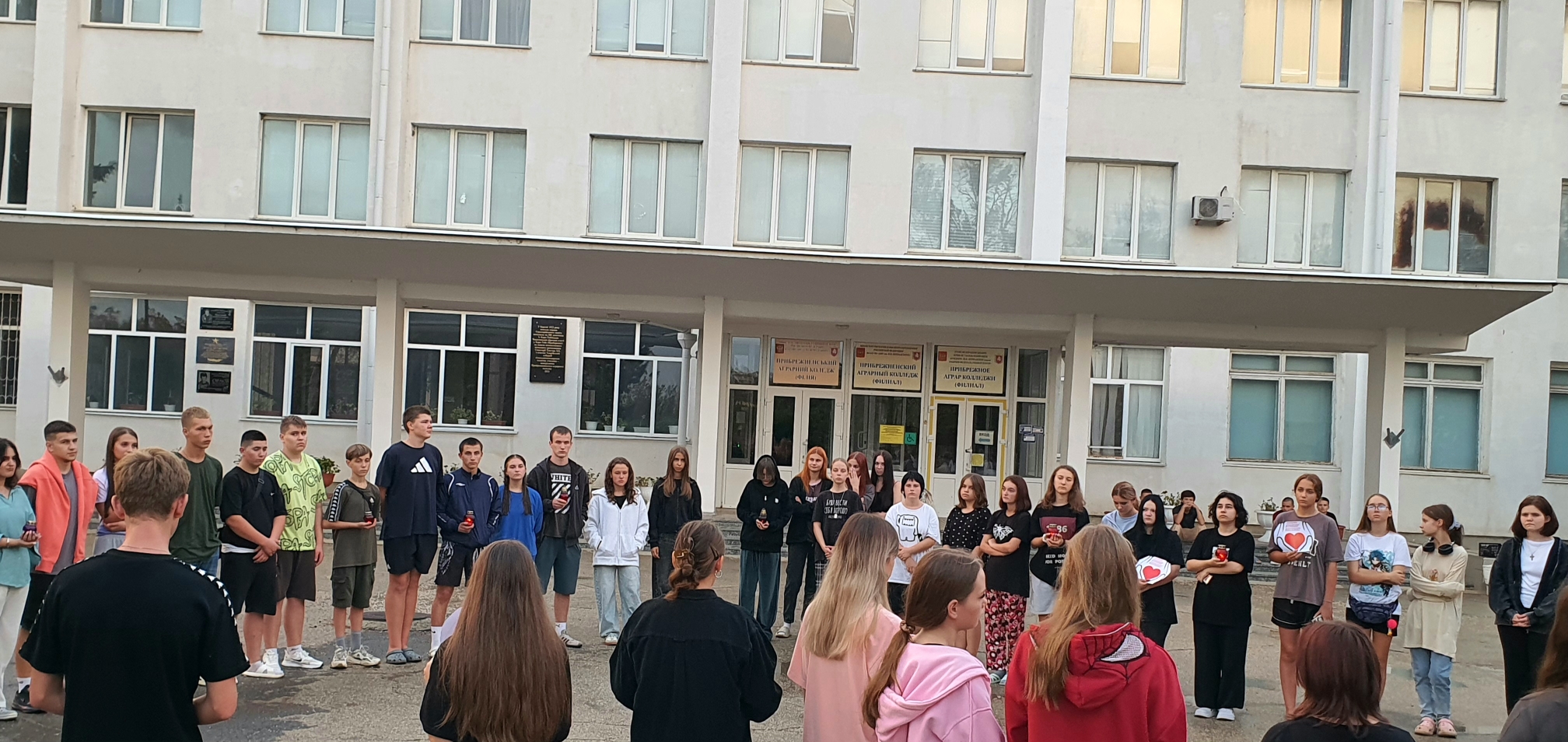 03 сентября 2025 года, в День солидарности в борьбе с терроризмом, в общежитии №1 Прибрежненского аграрного колледжа, состоялся траурный митинг, посвященный памяти жертв трагедии, произошедшей в Беслане в сентябре 2004 года. Организатором мероприятия выступила воспитатель Л.Н. Гафарова, собравшая учащихся 1-го и 2-го курсов.