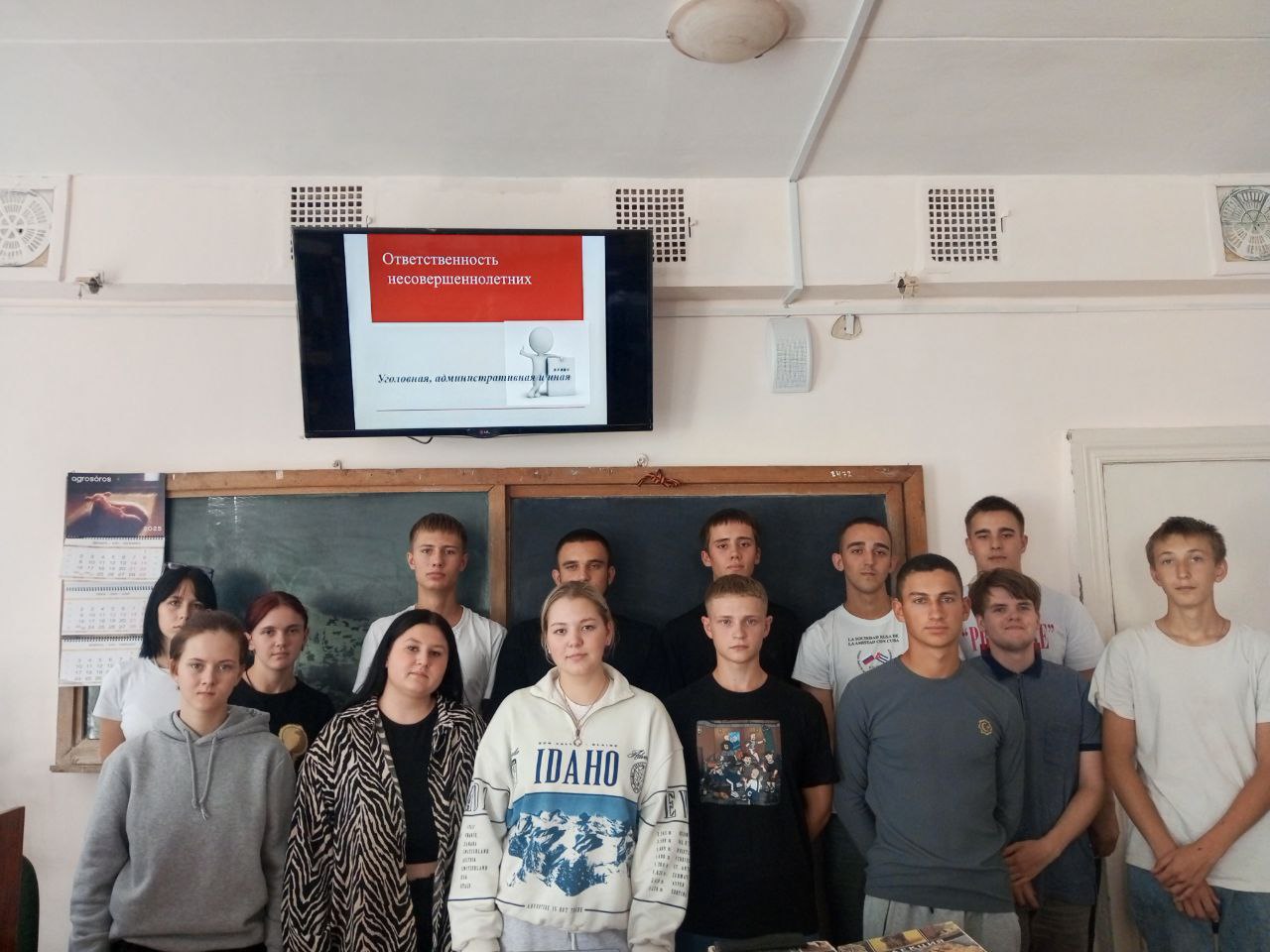 11 сентября 2025 года, в учебных аудиториях Прибрежненского аграрного колледжа, кураторами: Афанасьевой Е. С., Вильчевским А.В., Усеиновым Т.Р., Сахащик Е.Ю., Даревич В.В., Перегуд Е.В., Гнатовской Т.Е., Пронь Т.П. были проведены классные часы по профилактике правонарушений среди подростков на тему «Уголовная и административная ответственность за преступления и правонарушения, совершаемые несовершеннолетними и совершеннолетними гражданами».