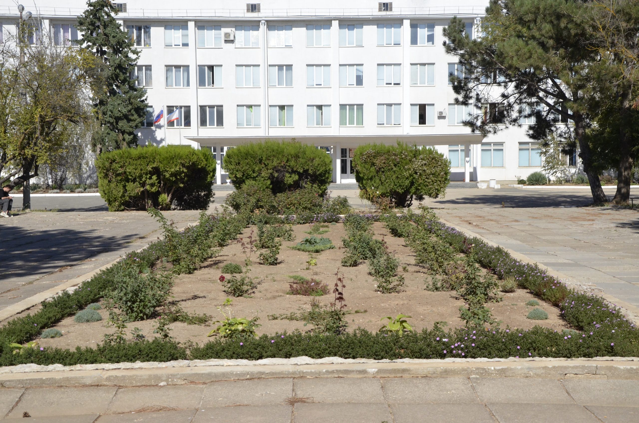 Неиспользуемый много лет бассейн длинною в 23 метра волевым решением директора колледжа А.Н. Хаировой был засыпан землей и превращен в чудесный цветник.