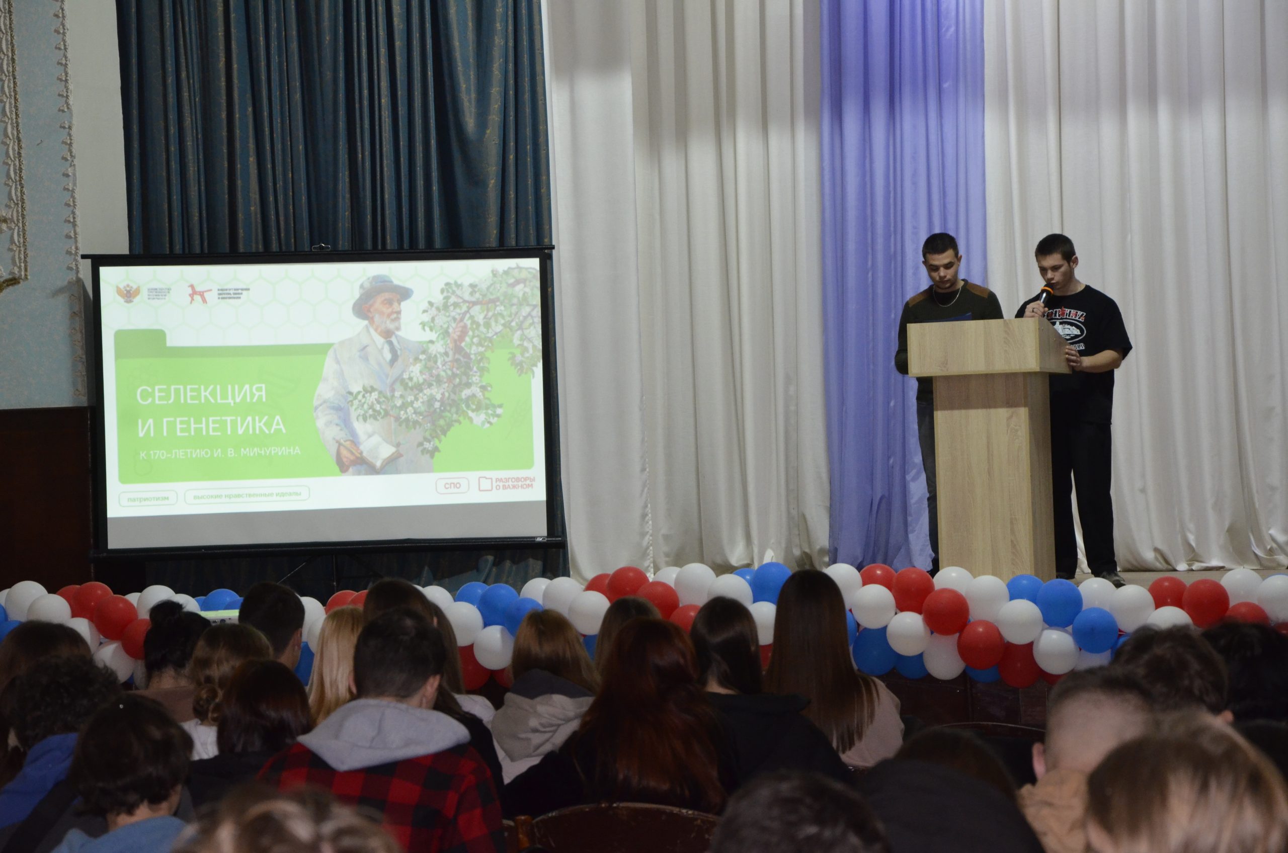 18-19 ноября 2025 года, в актовом зале Прибрежненского аграрного колледжа, под руководством преподавателя Э.А. Османовой состоялись тематические линейки отделений из цикла «Разговоры о важном» на тему: «Селекция и генетика. К 170-летию И.В. Мичурина».