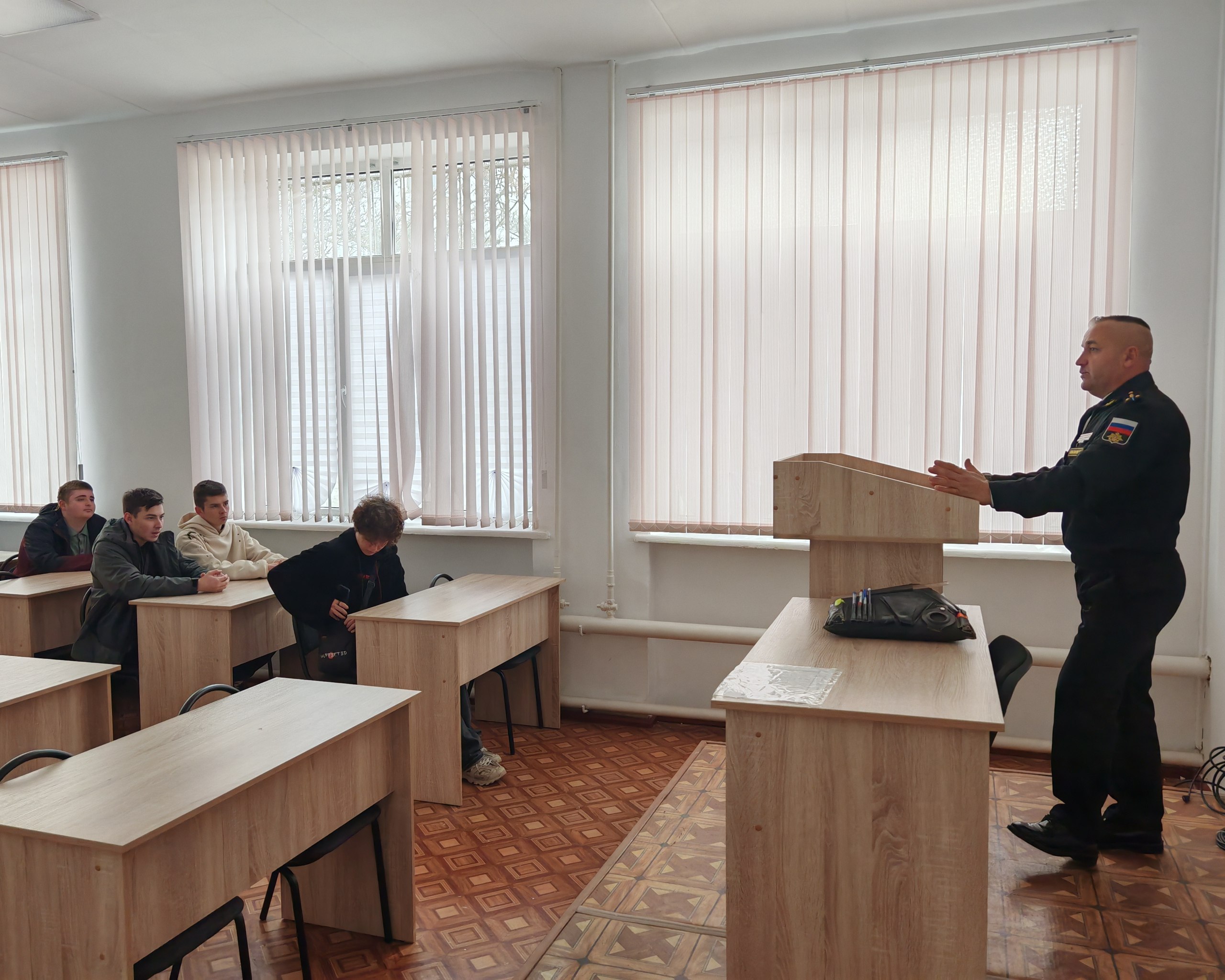 В рамках системы профориентации и взаимодействия с вузами в Прибрежненском аграрном колледже состоялась встреча с представителем Черноморского высшего военно-морского орденов Нахимова и Красной Звезды училища имени П.С. Нахимова (г. Севастополь) – Ковальчуком Валентином Петровичем.