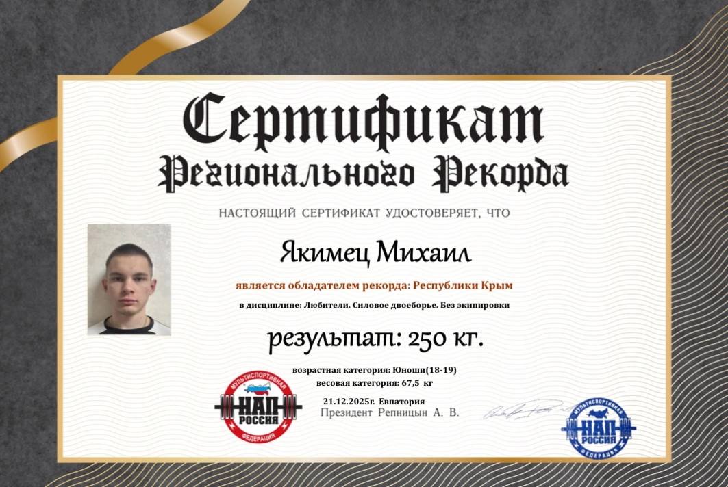 Обучающийся 41-В группы Прибрежненского аграрного колледжа Якимец Михаил Сергеевич принял участие в турнире и занял почетное 1 место в дисциплине: «Любители. Силовое двоеборье без экипировки» с результатом 250 кг.