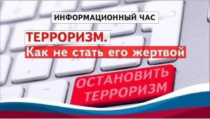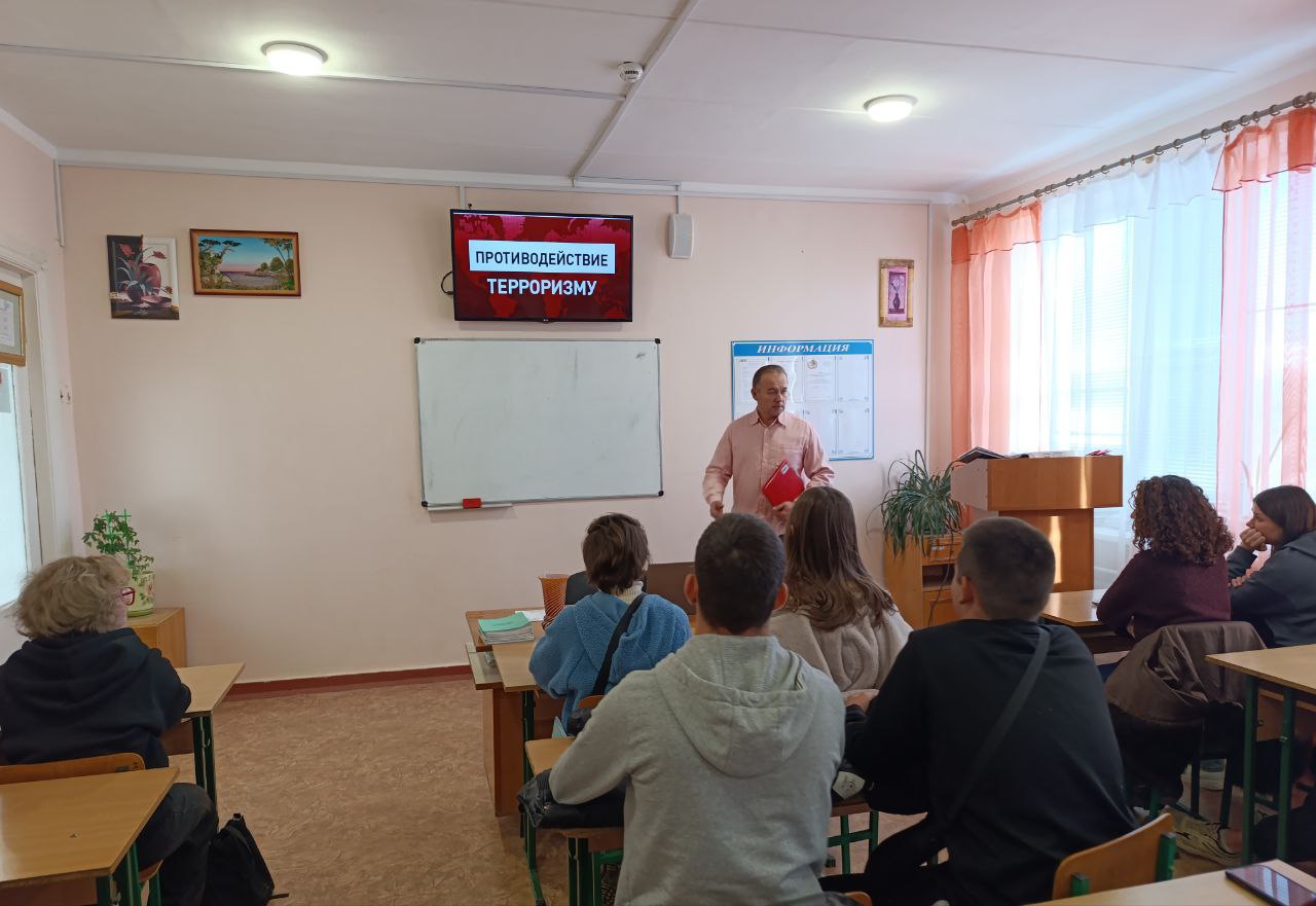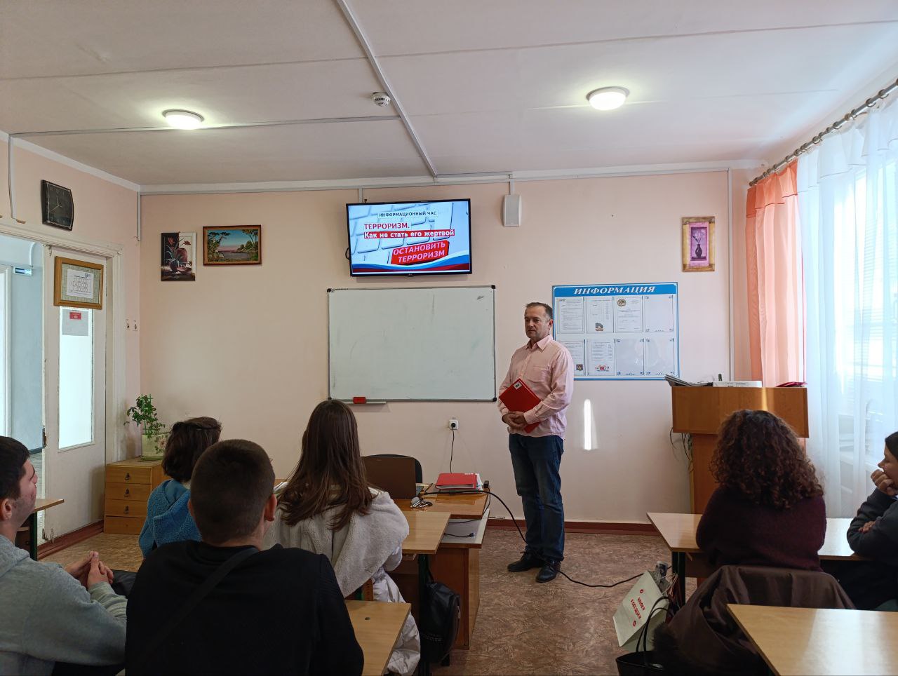 Тема урока — противодействие терроризму. Терроризм — очень серьезная проблема в настоящем и ещё более значительная угроза в будущем. Количество террористических актов постоянно увеличивается, они становятся все более жестокими. Чтобы победить современный терроризм,мало бороться с его непосредственными проявлениями – нужно нейтрализовать факторы, которые способствуют его возникновению и развитию, все это обсуждали обучающиеся, после чего просмотрели документальный фильм «Путь в никуда» о вербовке молодежи.