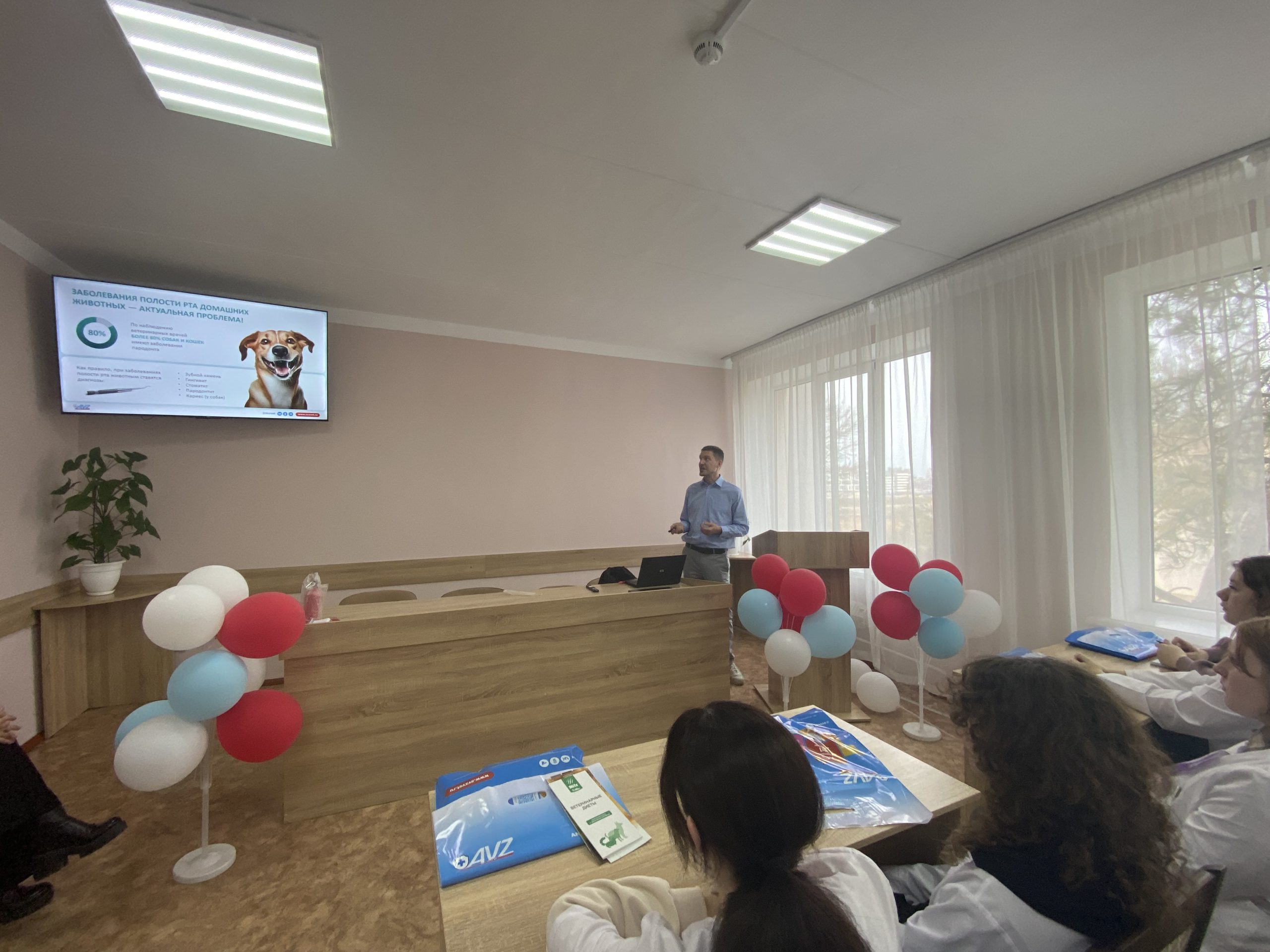 Спикером мероприятия выступил представитель компании Сергей Коломиец, который поделился с обучающимися современными подходами к лечению и последними разработками в области ветеринарных препаратов.
